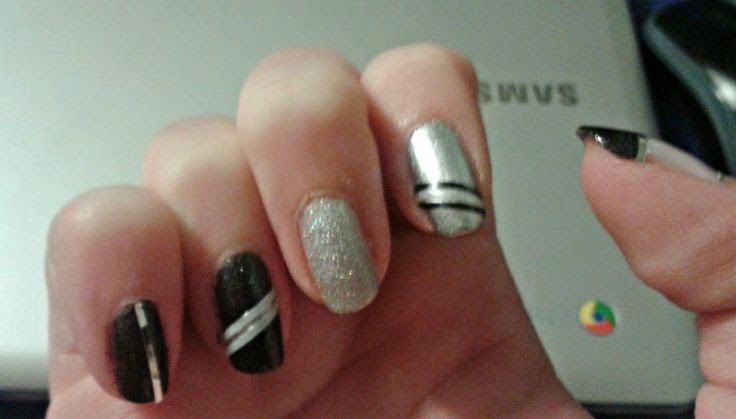 Her thumbs were kind of hard. I painted the bottom half with Sally Hansen Hard As Nails Pumping Iron and then the tips with Sinful Colors Secret Admirer. I think it would have been easier if I painted the whole nail with the white and then added the black to the tips. Of course, this occurred to me after I'd already put the polish on the hard way! Thankfully the striping tape hides a lot of flaws!! I put a silver stripe between the black and white polishes.